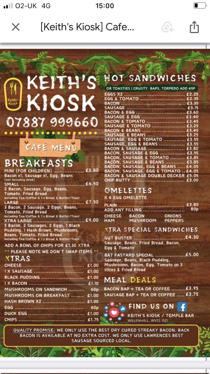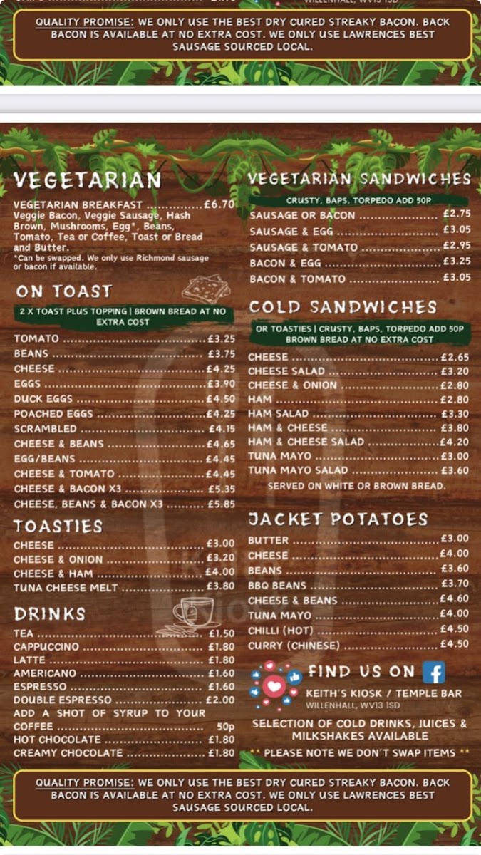 Introducing the menu at Keith’s Kiosk, a charming café nestled inside RK Transport in Willenhall, UK, where comfort meets quality. Known for its exceptional breakfast offerings, the menu showcases hearty favorites that delight every palate. Customers rave about the generous portions of bacon, sausage, and eggs, all cooked to perfection, crafting a truly satisfying start to the day.
